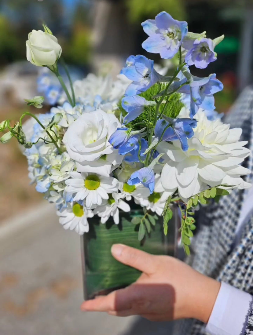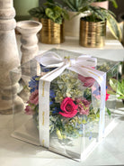 Our Signature Bloom Box features a carefully curated arrangement of fresh seasonal flowers, elegantly displayed in a clear box and finished with our signature ribbon. Designed to be both modern and timeless, this piece highlights the natural beauty of each bloom from every angle.