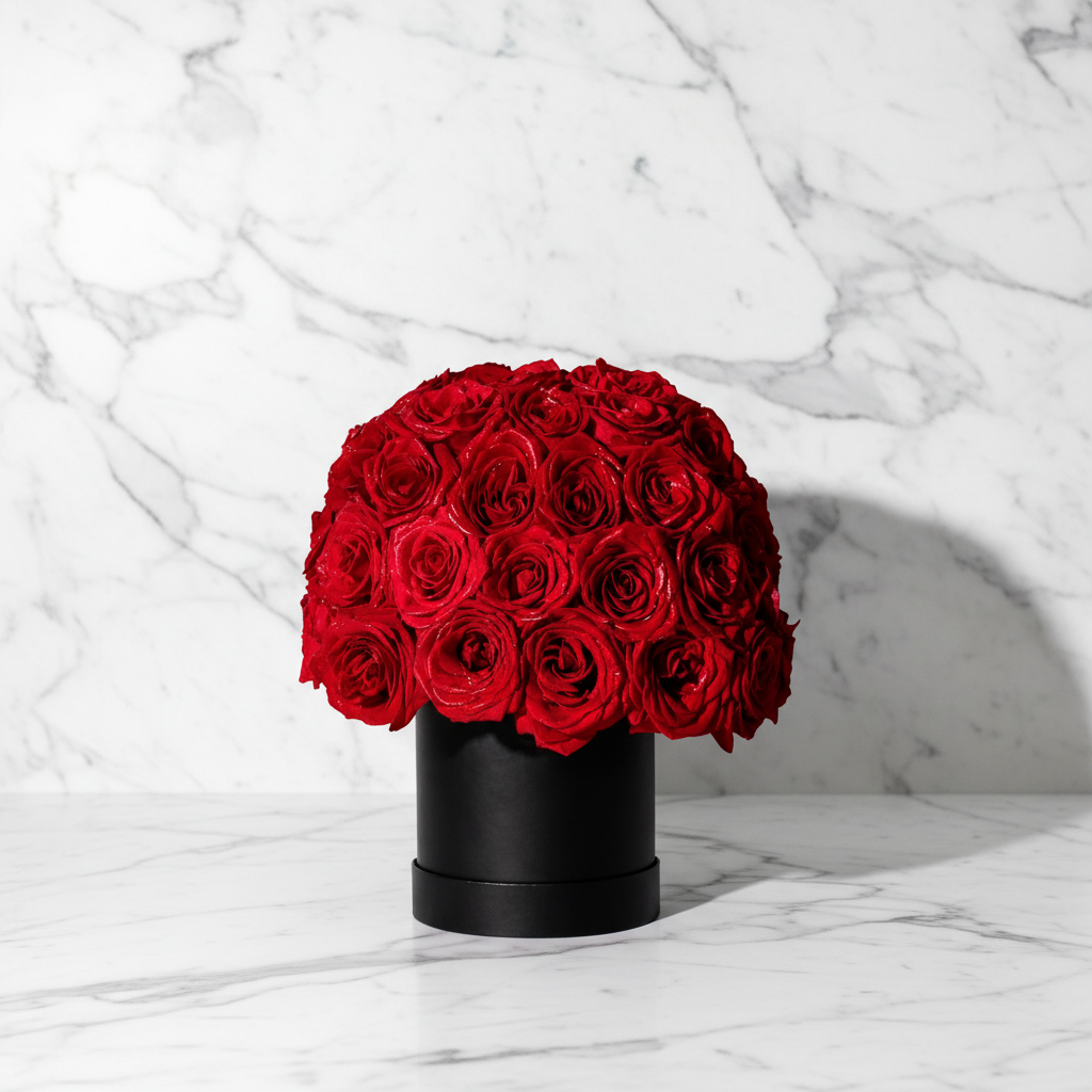 This exquisite arrangement features premium long-stem red roses, meticulously hand-placed in our signature matte black hat box—a timeless symbol of sophistication and modern luxury. Each rose is selected at peak bloom for its velvety petals, rich color, and flawless form.