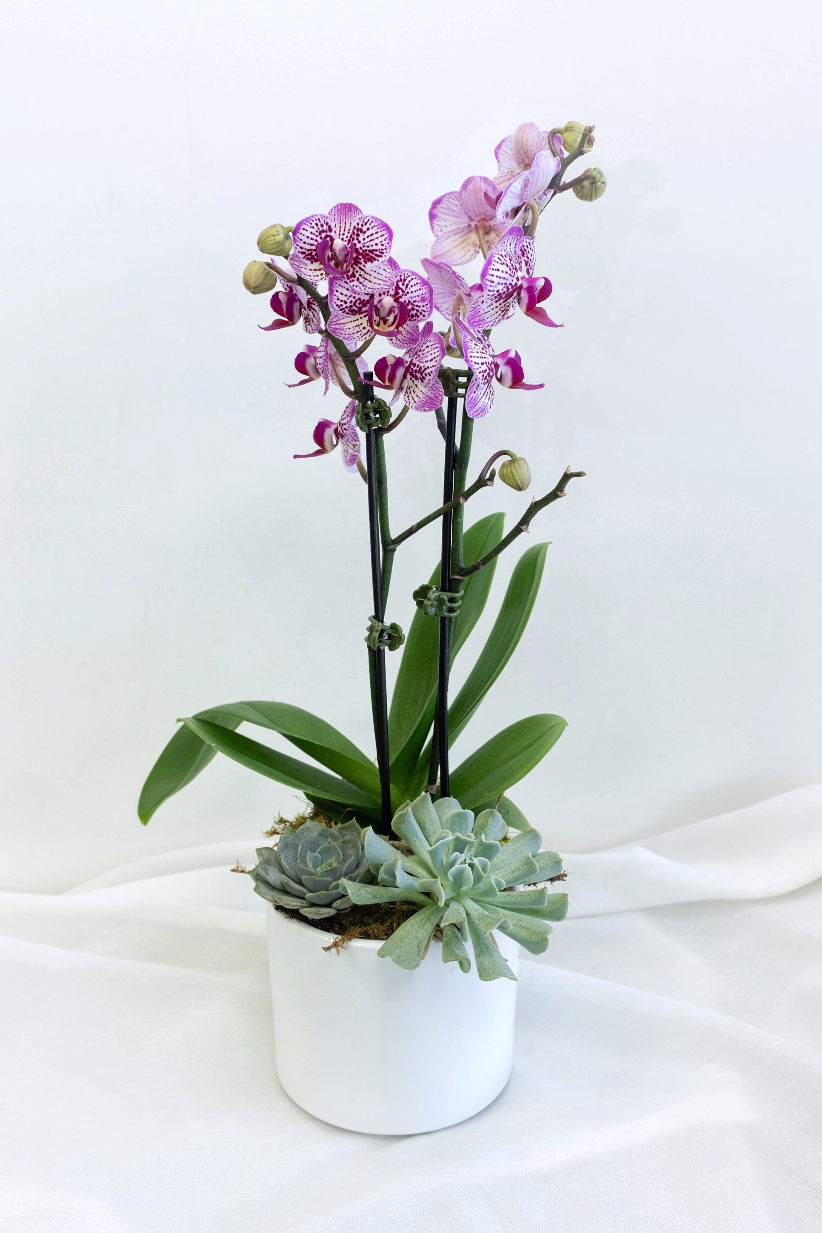 Please contact us for details. Due to seasonal availability, the colours of orchid and the composition may vary, and substitutions may be made with comparable flowers.