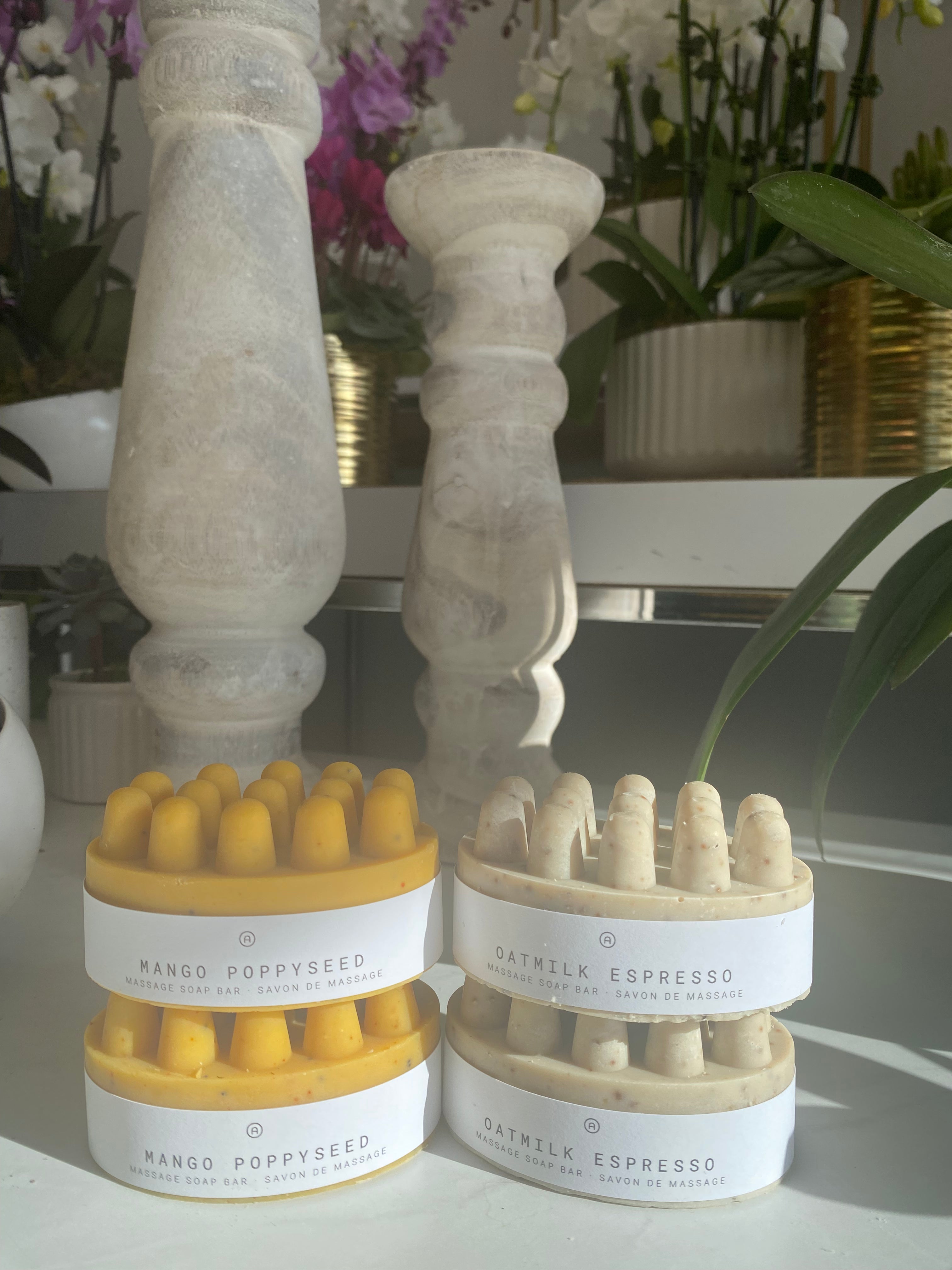 Our Oatmilk Espresso Massage Soap Bar is a rich, invigorating cleanser that combines gentle exfoliation with deep nourishment. Finely ground coffee stimulates circulation while colloidal oats soothe and soften, creating a balance of renewal and calm for the skin. A blend of olive oil, coconut oil, cocoa butter, and shea butter delivers a creamy lather that hydrates and comforts, while the bar’s raised massage texture provides a gentle stimulation that restores energy to tired muscles.